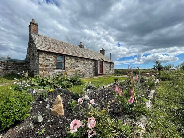 The setting is inspiring and calming. Set within an acre of wildflower meadow the cottage sits under the large Caithness skies because the landscape in the far north is relatively flat, meaning that the views are vast from the cottage. The cliffs of Hoy can be seen when clear and if the light is right The Old Man of Hoy can be made out. Dunnet Head rises above the surrounding landscape., and generally sea views are enjoyed out of most windows of Mey Bee - thankfully, the owner has created window seats to enjoy said views.