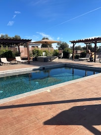 Yes, this property has an outdoor pool. Pool access is from 8:00 AM to 10:00 PM.
