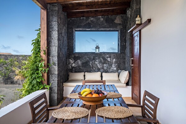 Outdoor dining - Idyllic Holiday Home "Finca La Costa" with Garden, Whirlpool, Sea View, Wi-Fi & TV; Parking Available (Tinajo)