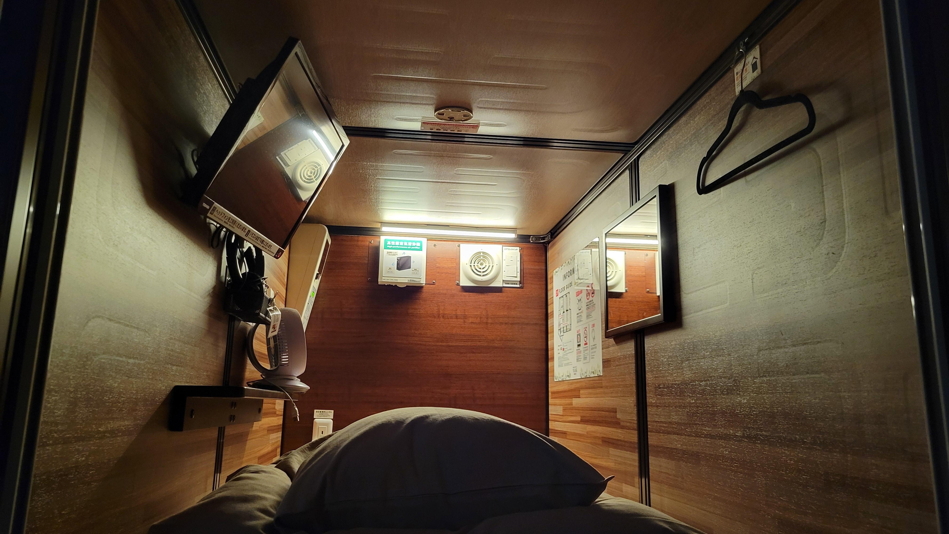It was very relaxing with an onsen downstairs and a lounge upstairs. The capsule rooms were very clean and comfortable, with outlets for your things, a personal fan and ac, and a sliding door.
