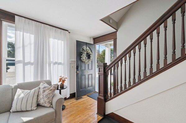 Enjoy the entire private home primely located in Uptown Maumee right in the center of all the action! This 1862 built house has charm for days. Enter using the electronic lock system. Original staircase, trim and hardwood floors great you. The 1st floor includes high ceilings and a separate living/dining area. The living room boasts 2 couches (one is a Queen mattress pull out), end tables, plenty of lamps & lights, coffee table and Smart TV w/ Sling TV provided (like basic cable) or you may use your own log in for other streaming apps.