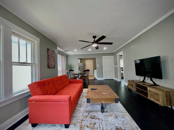 This beautifully remodeled home is centrally located to downtown, highway access, hospitals, and Washburn University. Enjoy a spacious stay with ample storage space for longer bookings.