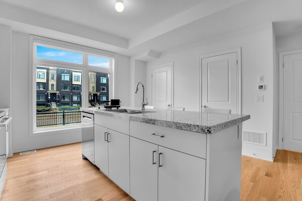 MAIN FLOOR ✔ Open-concept living room with Smart TV ✔ Dining area for 2 ✔ Fully equipped kitchen ✔ Half bathroom (powder room)
