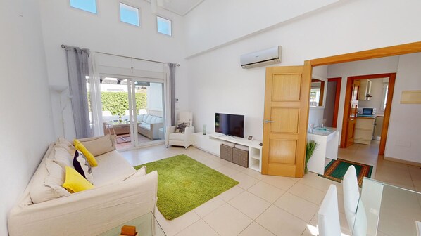 There is a spacious living room / diner with high ceilings, dining table and chairs, sofa and TV with standard La Torre channels.