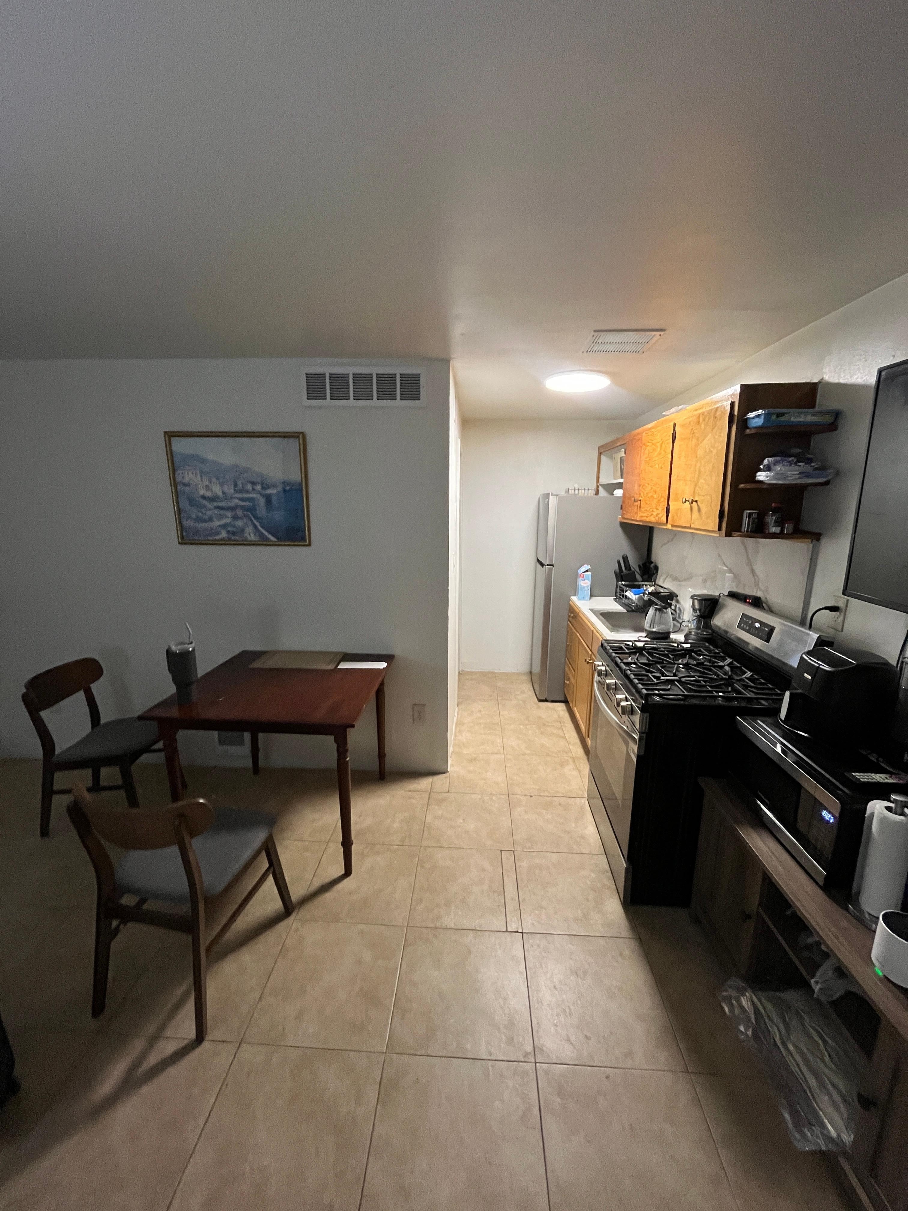 • Kitchen: Fully equipped for long stays with a gas range/oven, microwave, air fryer, and a new 18-cu ft fridge. We provide all essential cookware, plates, and utensils.