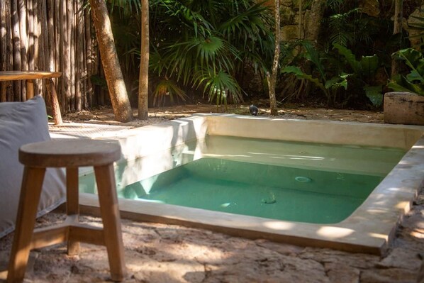 The private patio includes a small pool surrounded by native plants, creating an outdoor space suitable for resting.