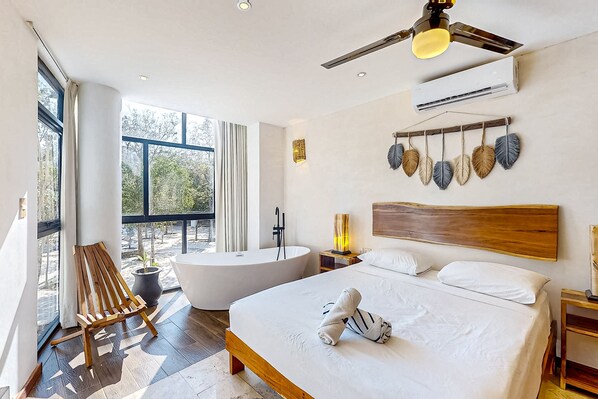 Ground-floor apt near downtown Tulum with rooftop pool, gym, soaking tub, & AC