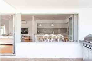 On Northpoint, nestled in the heart of Salt Village on North Point Avenue, is a haven for relaxation and entertainment. With its north-facing sunny undercover entertainment area featuring a BBQ overlooking the heated swimming pool and expansive grassed lawn perfect for kids to play, this holiday home embodies the essence of coastal living.