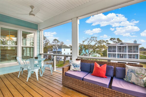 Step into the elevator for an easy ride to the second floor. A sitting room, complete with a television and easy chairs, provides a cozy spot to relax after a day at the beach. Sliding doors lead to the second-floor balcony, a covered aerie that twins with the one below. It's a great place to share a sweet tea with friends and enjoy the verdant views.