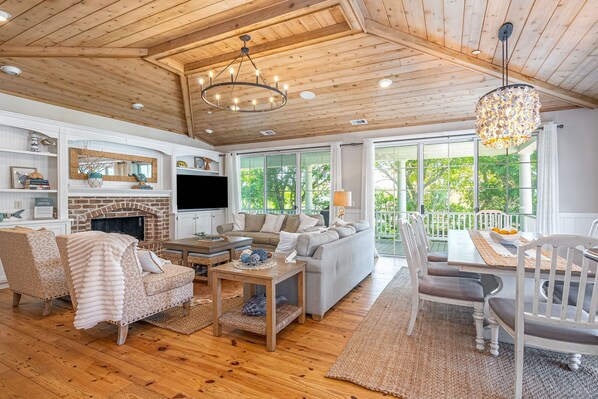 The living room is the heart of the home, complete with a cozy fireplace and easy indoor-outdoor access to the porch — ideal for morning coffee, evening conversations, or winding down after dinner.