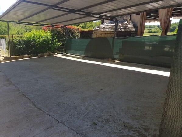 Apertman nalazi se u prizemlju privatne kuće, osiguran je pokriveni parking za 3 auta, poseban ulaz neovisan o drugima.Ulazite u dvorište sa kaminom za gril, stol veliki sa klupama i vanjski bazen sa ležaljkama i ručnicima za plažu.vanjski tuš,ulaz u pokrivenu i djelomično zatvorenu terasu na kojoj je garnitura za sjedenje i stol. ulazite u apartman gdje je potpuno opremljena kuhinja, TV blagovaonski stol i stolice i kauč,desno od kuhinje nalazi se predprostor i kupatilo.Lijevo ok kuhinje jedna spavaća soba,po hodniku ravno drzga spavaća soba i treća spavaća soba koja ima predprostor sa veš mašinu i kupatilo.Pogled sa terase je na park ispred i polja i šuma sa strane.Park je ograđen u sklopu apartmana i pogodan je za djecu ili jednog psa.Nalazimo se 800m od autoputa, 2 km od slovenske granice,U blizini imate mini market restoran,5 km smo od mora.Najbliži gradovi Umag,Buje,Novigrad,Za one koji vole u blizini je aquapark Istralandia, ili Crveni vrh sa svojim golf terenima.