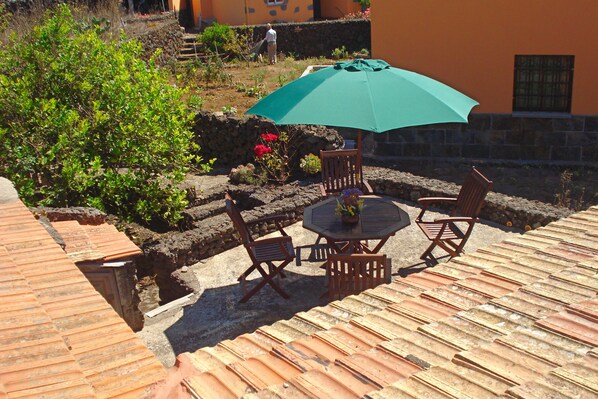 Insides, services and others: Inside: Pretty rural canary style house of lava and wood ceilings, outside stone floor, friendly sleep-living room with sofa bed for two people, dormitory with double bed and old epoch furniture which gives to the house an air of age, chimney, dormer, bath lined also with lava stones, typical canary kitchen with all the necessary equipment for a comfortable stay and a pretty stone porch with barbecue to enjoy roasters outdoors. Capacity for four people, two in double bed and two in sofa bed.