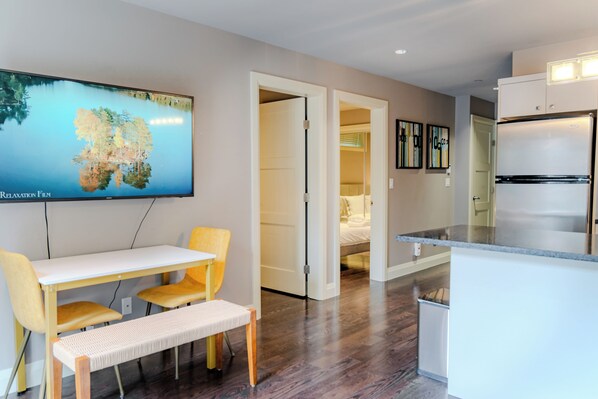 Welcome to our cozy, modern retreat in the heart of Vancouver! This centrally located 2BR suite features two comfortable queen beds and a sofa bed, accommodating up to 5 guests. Enjoy the convenience of a full kitchen for home-cooked meals and unwind in the evenings with a 55-inch smart TV. With stylish décor and easy access to local attractions and public transport, this suite offers the perfect blend of comfort and convenience for your Vancouver stay.