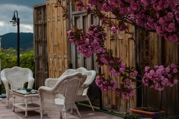 Guests unwind in the peaceful gardens of Jardín del Río Cuervo Aparthotel Biosostenible while enjoying meals at the restaurant. The property offers free bike rentals for exploring, a cozy library, WiFi, and staff who provide helpful tour and ticket assistance.