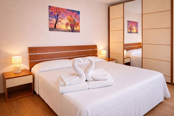 The spacious double bedroom features a large wardrobe, stocked with all the necessary linens for maximum comfort. The functional and well-organized bathroom offers a shower, bidet, washing machine, and a complete set of towels.
