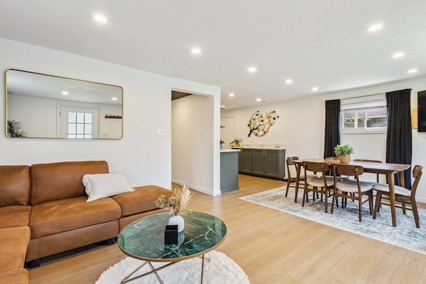 - Chic, open-concept living and dining area