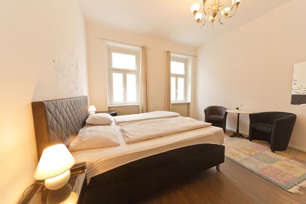 Double bed 180x200, bedside table, large wardrobe and storage space