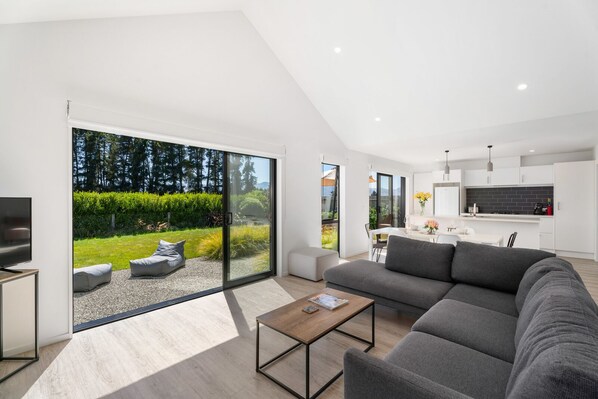 Beautifully presented with neutral tones and modern décor, the open-plan living provides a warm and inviting space. The kitchen is fresh and functional with modern appliances and a centre-island bench and flows through to the dining and living area. Relax and unwind with a corner sofa, fireplace, heat pump, WiFi and TV with Chromecast, while an additional living area provides added convenience.