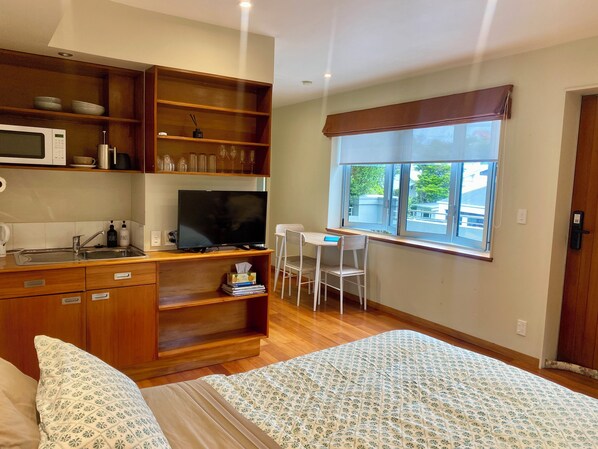 This light, bright self-contained studio apartment with cosy Queen bed, shower ensuite, kitchenette and large sunny deck is the perfect base for exploring Wellington.