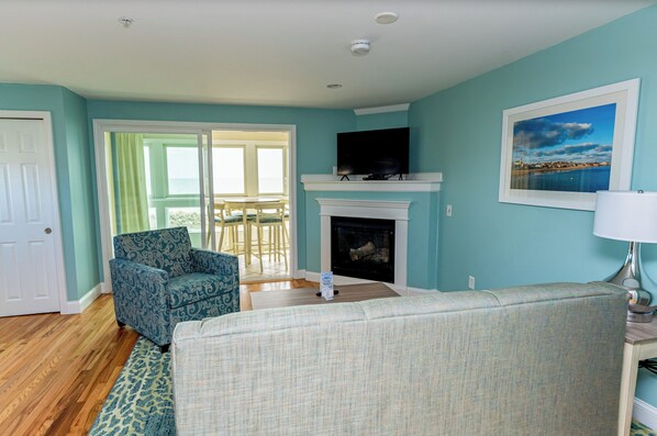 Two Bedroom Suites feature a private master bedroom, a second bedroom with separate entrance. Each unit has a shared living space with ocean views, fully equipped kitchenette, and full bathroom with shower/tub. The master bedroom is furnished with a queen size bed, flat screen television, and a private second full bathroom. Most second bedrooms are furnished with two twin beds, flat screen television, and window views of the courtyard and ocean. Units are positioned around a courtyard in the East, Center, and West wings of the resort, both on the first and the second floors with a fireplace. First floor rooms enjoy a partitioned outdoor patio with a six person patio table and umbrella, while second floor units are designed with a partially enclosed private balcony with table and seating for six. These units comfortably sleep six.