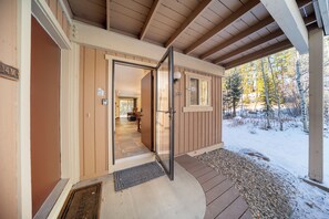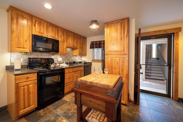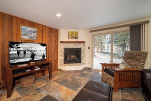 Beaver Village Condos offers a charming ground floor end unit with an updated gas fireplace and tiled in-floor heat. From the patio sliding doors or dining room window, catch a glimpse of wildlife like moose or foxes outside. The master bedroom has a new King bed and TV while the second bedroom has 2 twin beds, both with en-suite bathrooms.