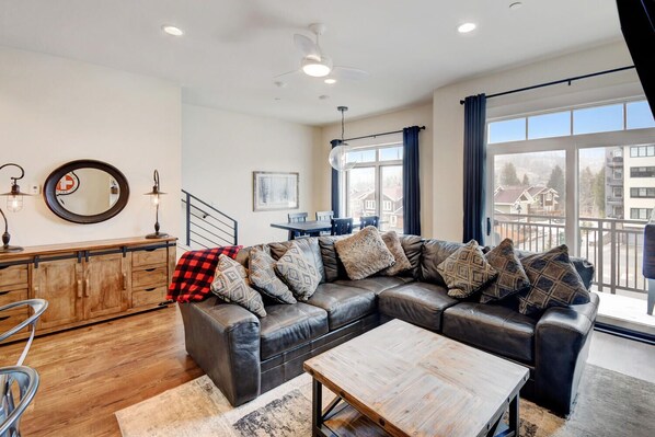 Spanning 1,250 square feet, this spacious loft features two well-appointed bedrooms and two and a half bathrooms, accommodating up to eight guests. The master bedroom boasts a plush king bed, while the guest bedroom offers a cozy full bed. Additional sleeping arrangements include a bunk bed and a queen sleeper sofa, ensuring everyone has a comfortable place to rest after a day of exploring.