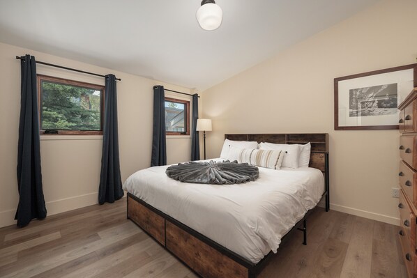 Moreover, this level features a private secondary king suite bedroom, which is accompanied by a full bathroom that boasts a single sink vanity and a tiled shower enclosure.