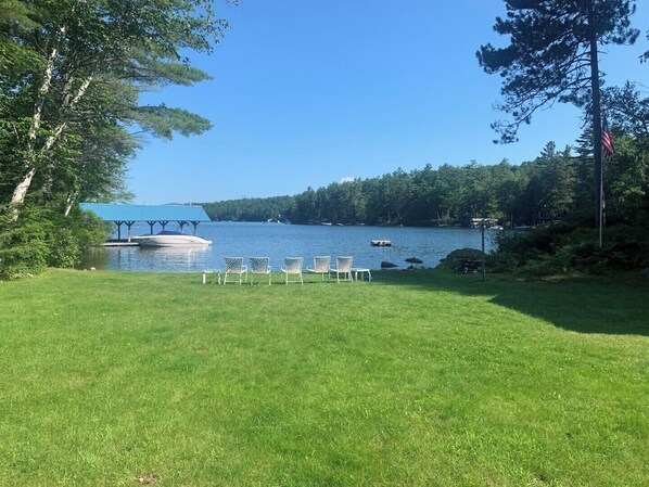 Charming Lakefront Family Compound on Delings Cove Discover the perfect family getaway at this delightful lakefront compound on Lake Winnipesaukee, offering a spacious main house, a cozy guest house, and all the amenities you need for a relaxing vacation. With a large lawn, sandy beach, and excellent docking, this property is ideal for making lasting memories on the water. Main House 3 Bedrooms, 2 Baths: Two bedrooms feature air conditioning for added comfort. Cozy Living Room: Relax by the fireplace after a day on the lake. Screened Porch & Large Deck: Perfect for outdoor dining or simply enjoying the peaceful surroundings. Rustic Charm: Knotty pine interiors add warmth and character to the space. Guest House 2 Bedrooms, 1 Bath: Comfortable accommodations for additional family members or friends. Full Kitchen: Fully equipped for convenience during your stay. Steps Away: Located just a short walk from the main house for easy access while maintaining privacy. Outdoor Features Sandy Beach & Large Lawn: Ideal for swimming, sunbathing, and outdoor games. Good Docking: Secure space for your boat and easy lake access. Serene Setting: Enjoy laid-back comfort with stunning views of Delings Cove. Convenient Location A short boat or car ride takes you to downtown Wolfeboro, where you can explore shops, dine at local restaurants, attend concerts, or stroll through the historic village. This property combines rustic charm with modern conveniences, making it the perfect destination for a relaxing and fun-filled lakeside vacation. Reserve your stay today and start creating unforgettable memories!