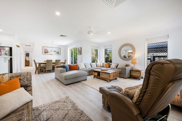 Kailani Beach House is a breath of fresh air in the exclusive 'Beachside Estate,' offering a comfortable coastal retreat. This beach chic styled home welcomes you with a huge soft leather couch and textured cushions, setting the tone for a laid-back and salty Yamba lifestyle.