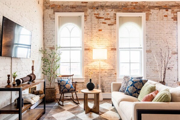 This beautiful and light filled space boasts 12 foot ceilings and exposed brick throughout. Enjoy the well appointed kitchen to cook a quick meal, or walk out your front door and enjoy a plethora of local restaurants at your fingertips! The loft boasts a luxurious king sized bed with a plush couch for conversation or TV! Enjoy views of downtown Depot Town and the train from your living room window!