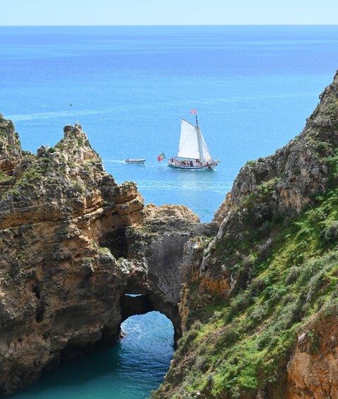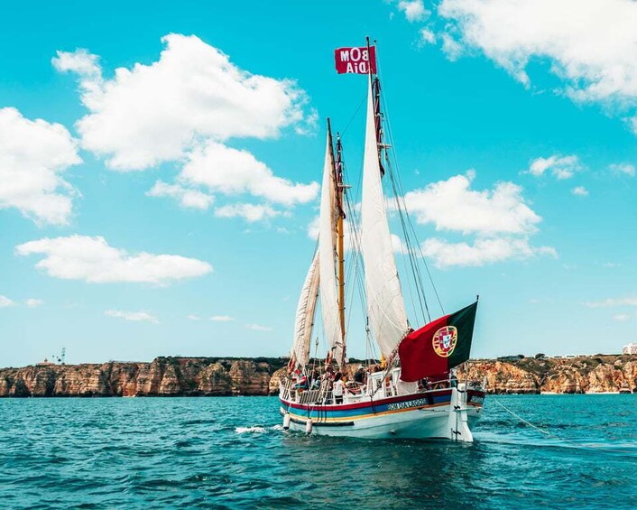 You'll set sail from Lagos aboard a traditional Portuguese sailing boat and experience the Algarve coast like never before. This extended 4-hour trip is the perfect way to combine adventure, relaxation, and local flavours while exploring one of Portugal’s most beautiful coastal areas.