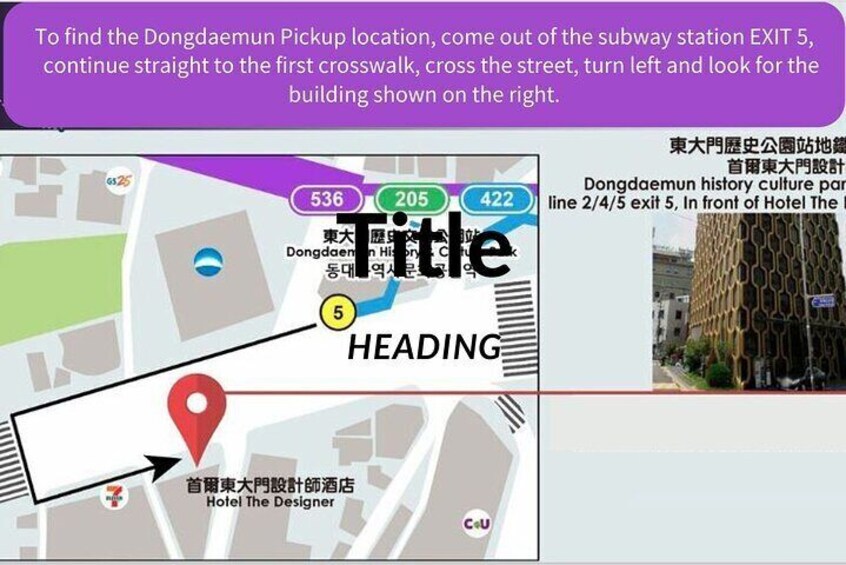 Hotel the Designers (DDP): Meets across from Dongdaemun History and Culture Park Station Exit 5, in front of Hotel The Designer. (See map in tour photos