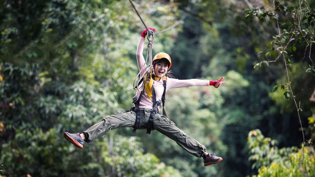 With the full course, you'll experience 33 ziplines, 34 platforms, sky bridges, 2 net ladders, 3 staircases, and 3 abseilings. The package includes an authentic Thai lunch and one water. The activity lasts approximately 2 to 2.5 hours.