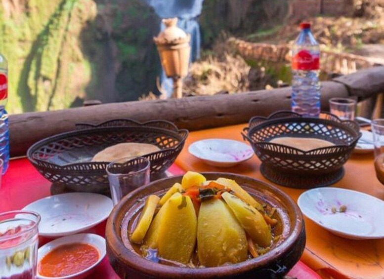 Then we will go to lunch in a restaurant in the top of the Mountains directly in front of the Ouzoud Waterfalls you do not need to bring food snacks or water because everything is available there on-site, have a sit to lunch delicious Barber Food while relaxing and enjoying the view and the purl.