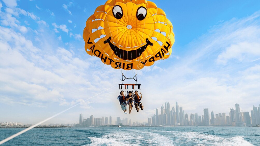 Enjoy an exciting parasailing ride with stunning views of JBR & Palm. This shared tour includes other guests too on the boat, but only your group flies together (each flight 2 people). Flight lasts 10-12 min; Total duration varies 45-90 min by guest count