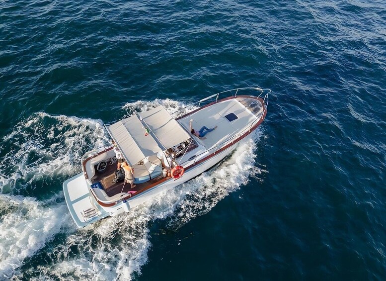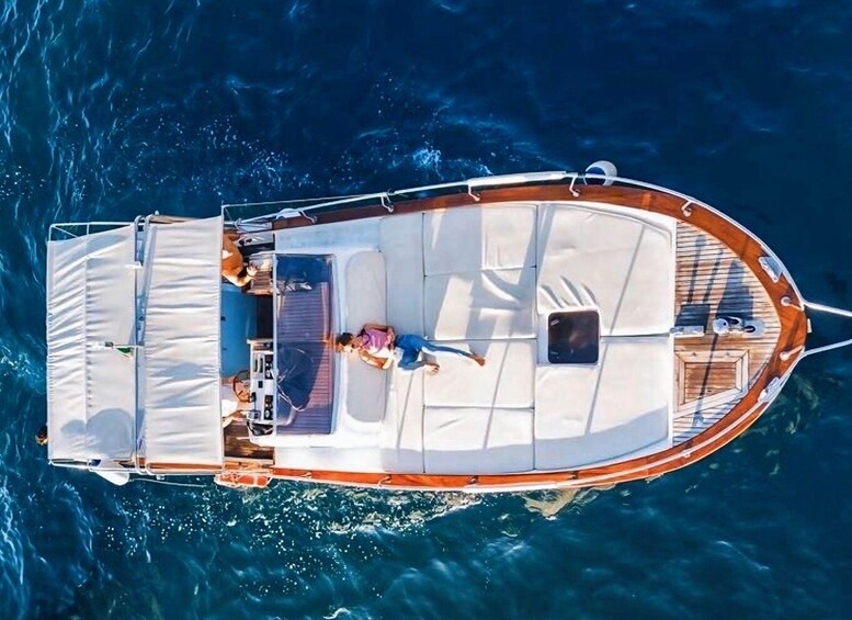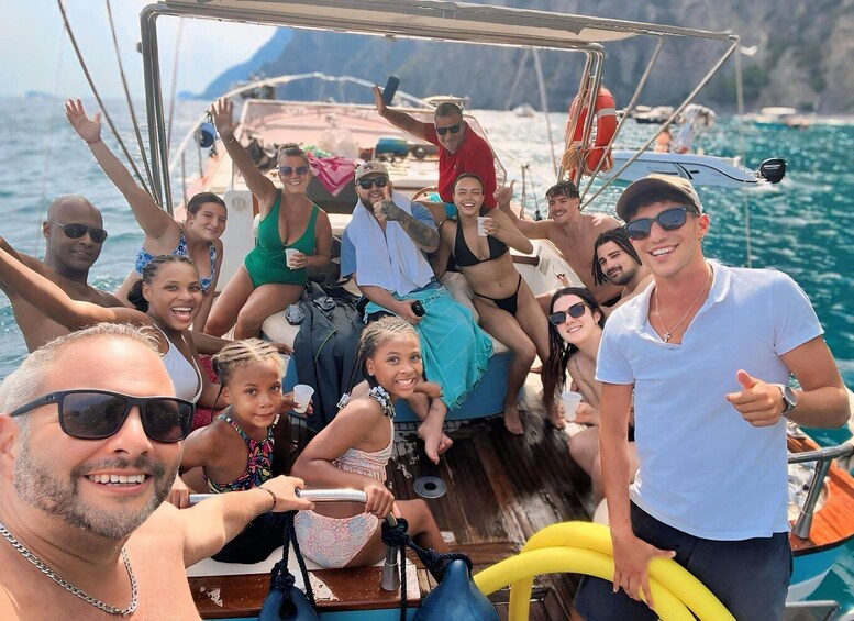 Sail aboard a classic gozzo sorrentino open and depart from the port of Sorrento for a scenic cruise towards Capri. Along the way, admire some of the most characteristic spots of the Sorrento coastline, including the ancient Roman villa of Queen Giovanna, the charming village of Massa Lubrense, and the spectacular cliffs of Punta Campanella.