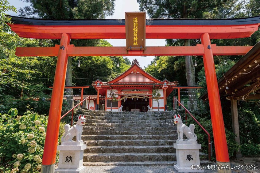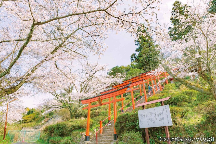 The tour then visits Ukiha Inari Shrine, known for its striking rows of red torii gates set against a hillside backdrop. From the viewpoint near the shrine, you can enjoy sweeping views of the countryside framed by seasonal blossoms, creating a unique combination of cultural and natural beauty.