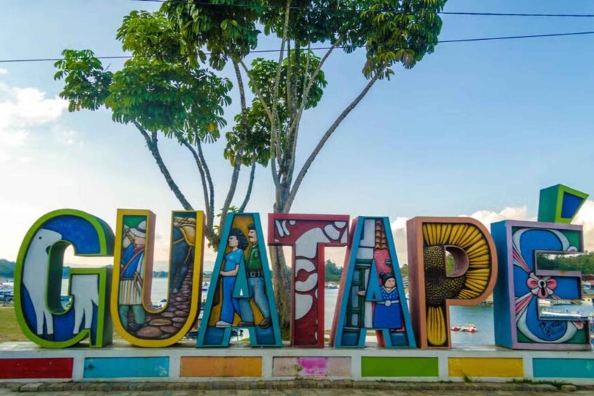 Before the end of the tour, you'll walk along the shore of the Guatapé reservoir along the boardwalk, where the famous sign with the name of the town is located.