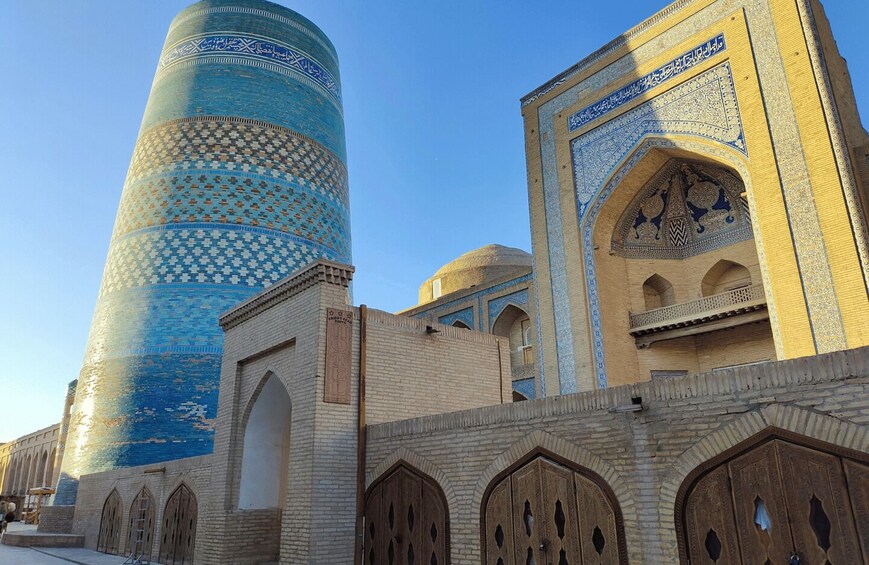 Start your walking sightseeing tour in ancient Khiva. Explore the walled inner town of the city of Khiva - Itchan Kala, a UNESCO site filled with mosques, madrasahs, and minarets. Visit the grand Mukhammad Aminkhan Madrasah, one of the largest in Central Asia with its richly tiled façade, and the elegant Mukhammad Rahimkhan Madrasah, known for its 19th-century architecture and cultural legacy. Admire the turquoise-tiled Kalta-Minor, the unfinished yet iconic minaret, and step into the Kunya-Ark, the former citadel and residence of Khiva’s rulers. Discover the unique Juma Mosque, supported by 200 carved wooden columns dating back centuries, and explore the ornate Tash-Khovli Palace, with its richly decorated courtyards and harem. End your walk at the Minaret of Islam-Khoja, the tallest in Khiva, offering panoramic views over the old town.