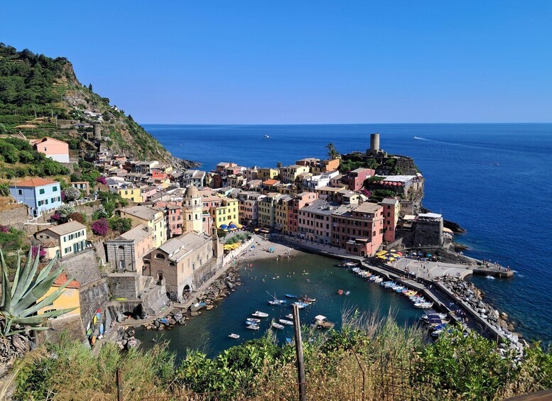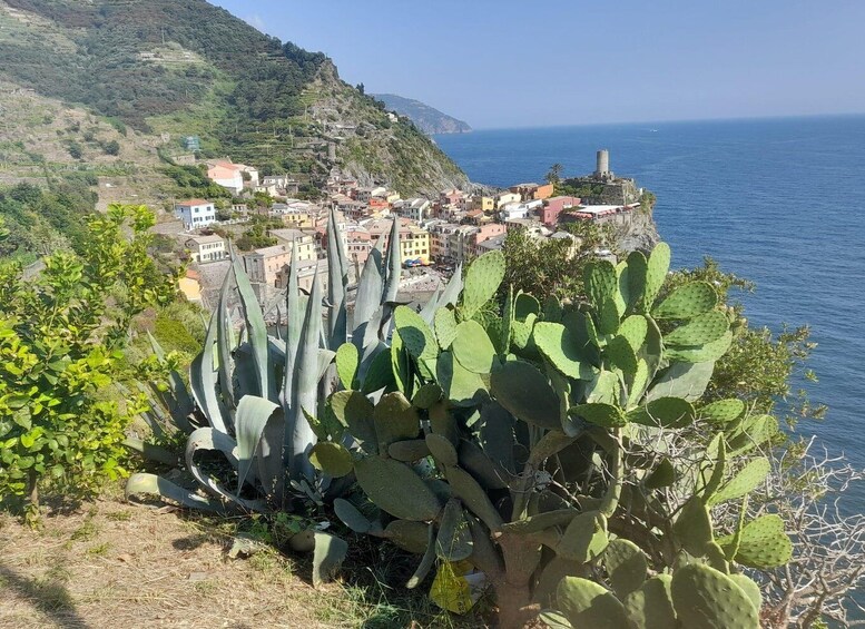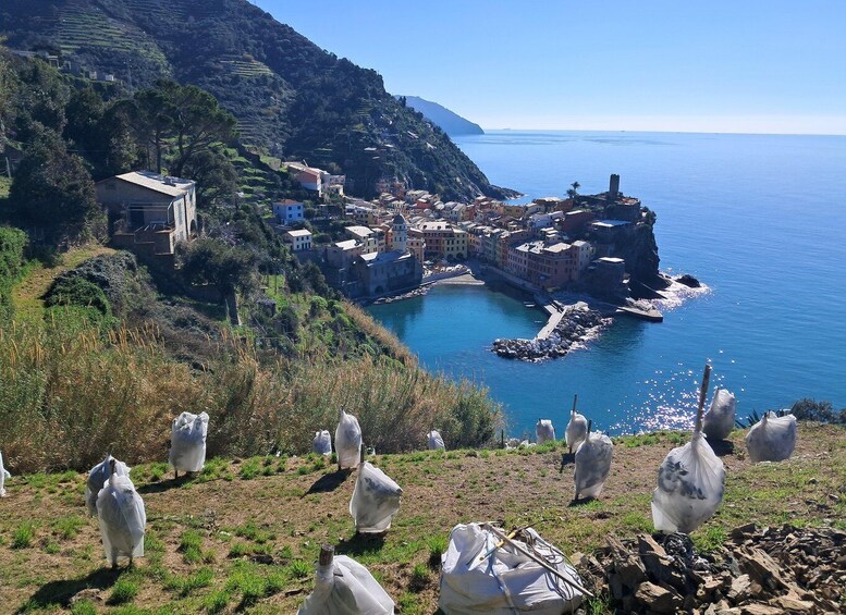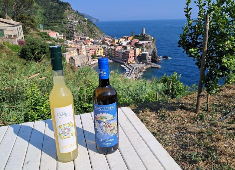 The excursion will start just below Vernazza station in front of the Azienda Agricola La Bottega shop. From there, we'll visit the old village (with its little square by the sea and the characteristic Church of Santa Margherita D'Antiochia), and then we'll walk along the Verde Azzurro path towards Monterosso, following the old pedestrian link road between the two villages. The route will wind through the characteristic terraced landscape of the Cinque Terre, where the work of man over about a thousand years has profoundly modified the steep slopes of the hills overlooking the sea in order to obtain small horizontal strips of land (the terraces or cian in the local language) supported by thousands of kilometres of dry stone walls. For centuries, the terraces have mainly been used to cultivate vines for the production of prestigious wines such as Cinque Terre and Sciacchetrà, both DOC. Along the way, you'll also enjoy beautiful views, especially of the villages of Vernazza and Monterosso and the entire Cinque Terre coastline. In about 20/30 minutes, you'll arrive at the beautiful lemon grove of the Azienda Agricola la Bottega, in Mavà, where the view of the village of Vernazza is sublime. There, you'll enjoy a tasting of limoncino (made with the lemons that surround you) and focaccia. If you like, you can also try our liqueurs, made with ingredients from the farm's land, which was reclaimed from abandonment, and a typical white wine from the Cinque Terre. For kids, we'll offer local, zero-kilometer juices.