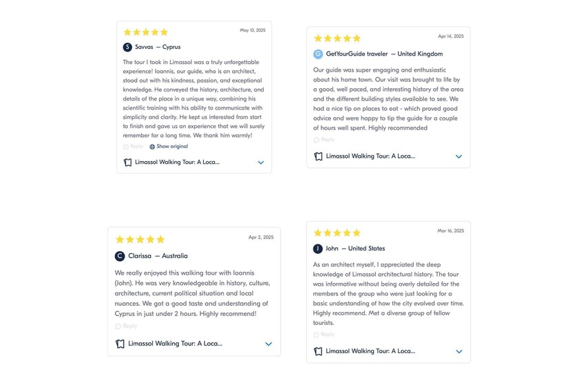 You’ll also discover my personal recommendations—places where the flavours of Cypriot cuisine mingle with global influences, hidden cocktail bars, and cosy spots perfect for a relaxed brunch or coffee. And as a special gift, you’ll receive my Limassol Outing Guide—a curated collection of the best places to see, eat, and explore, specially designed for you to continue your adventure after the tour.