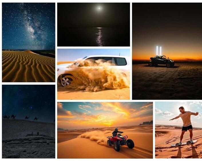 Step into the magic of Qatar’s desert after sunset with our guided night desert tour. As the heat fades, the golden dunes turn silver under the moonlight, setting the stage for an unforgettable experience. Ride in a comfortable 4x4 vehicle driven by our expert guide and explore the serene desert trails. tart your journey with a scenic drive into the golden dunes before hopping on an quad bike for a high-energy ride across the sands. Then, embrace tradition with a peaceful camel ride and test your balance with exhilarating sandboarding.