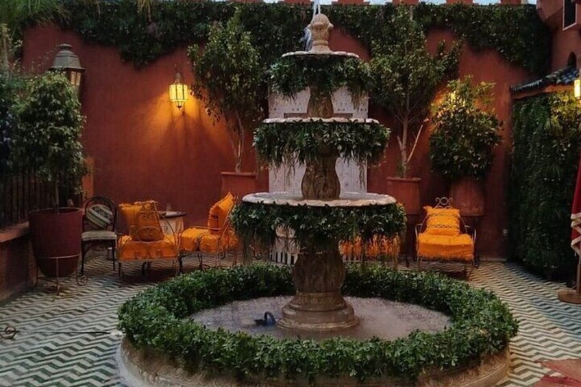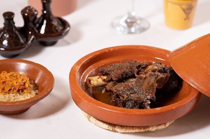 Classic menu: Moroccan salads. With lemons, meat with prunes, rfissa, minced meat tajine.Mineral and sparkling water, tea, Moroccan pastrie