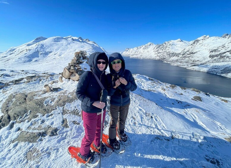 We walk at a relaxed pace, allowing you to truly feel the stillness of the Arctic. The trail leads gently upward to a small peak, where breathtaking views open up over two fjords, surrounded by soft, rounded mountains and wide winter horizons. This is not about speed or fitness — it is about presence, silence, and connection to nature.