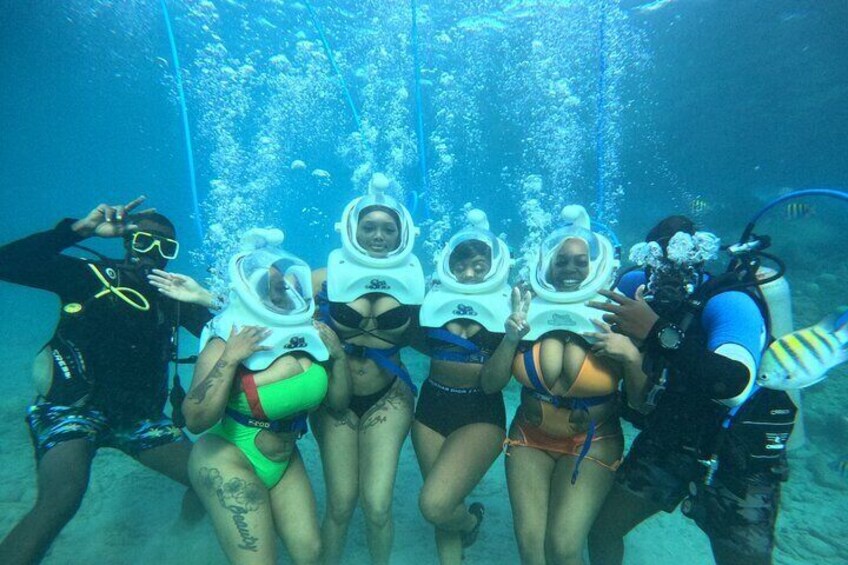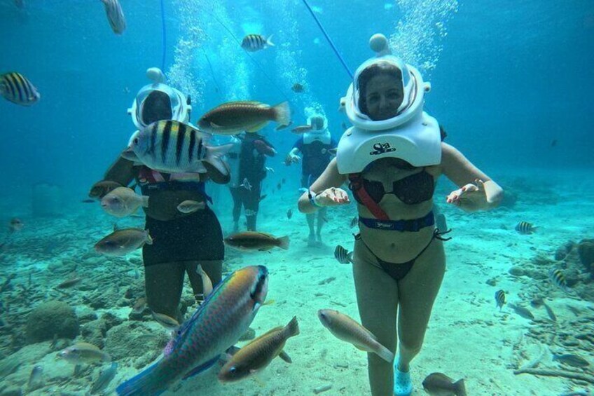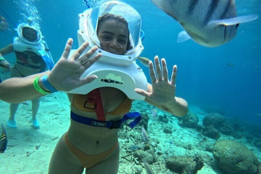 You’ll wear a custom designed Sea TREK helmet that weighs 32 kg (70 lbs) above water and just 6 kg (15 lbs) underwater. A blue air hose supplies 3x more air than needed, keeping your face and hair completely dry, no mouthpieces, no tanks, and no swimming skills required.